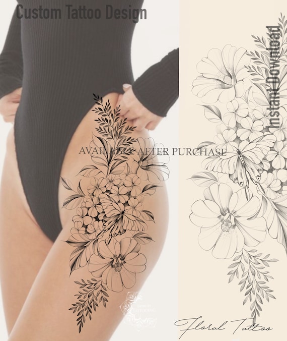 Floral Tattoo Design Hydrangea Butterfly Fern Leaves And Etsy